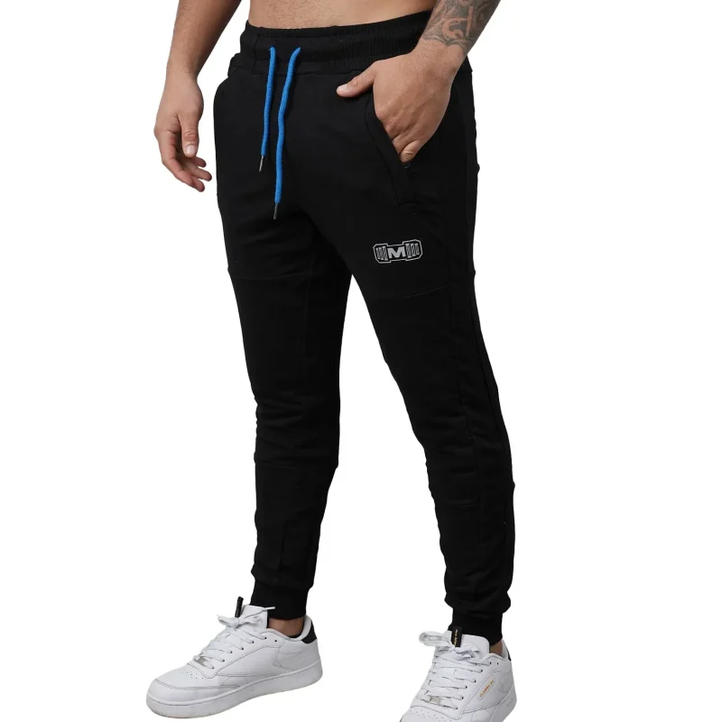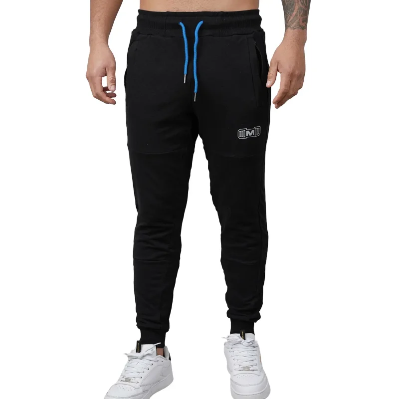 Jogger Deportivo color Negro con pasador ajustable color Azul. Ideal para entrenar, practicar deporte o uso casual. Hecho de Material french terry deportivo. Resistente y duradero. Cuenta con bolsillos laterales con cierre. bolsillo trasero sin cierre. Con estampado color reflectivo y diseño deportivo para mayor comodidad.