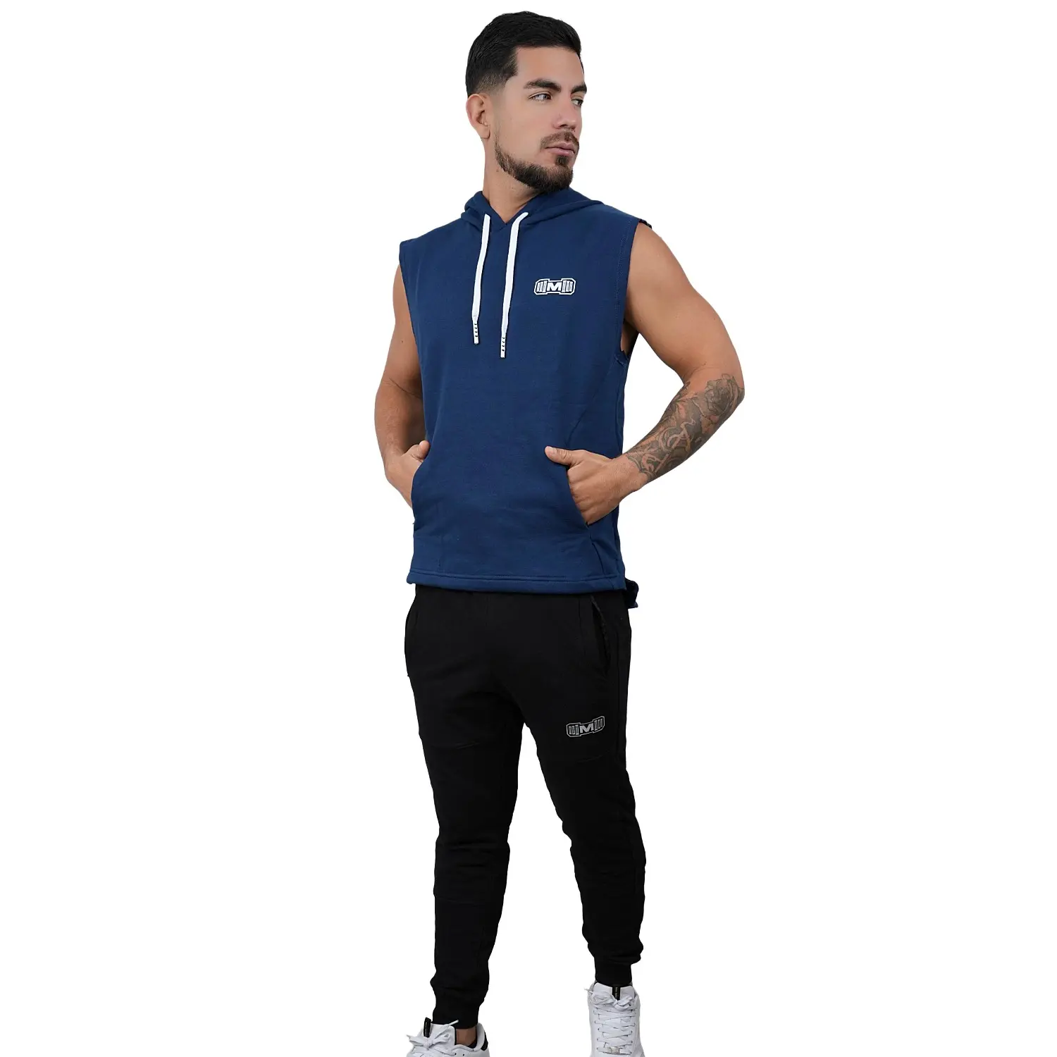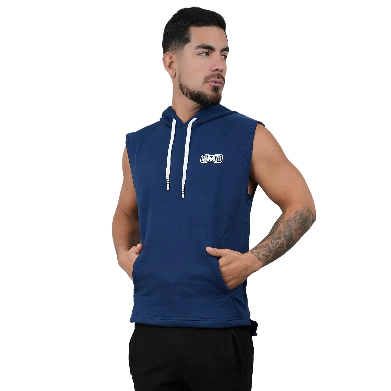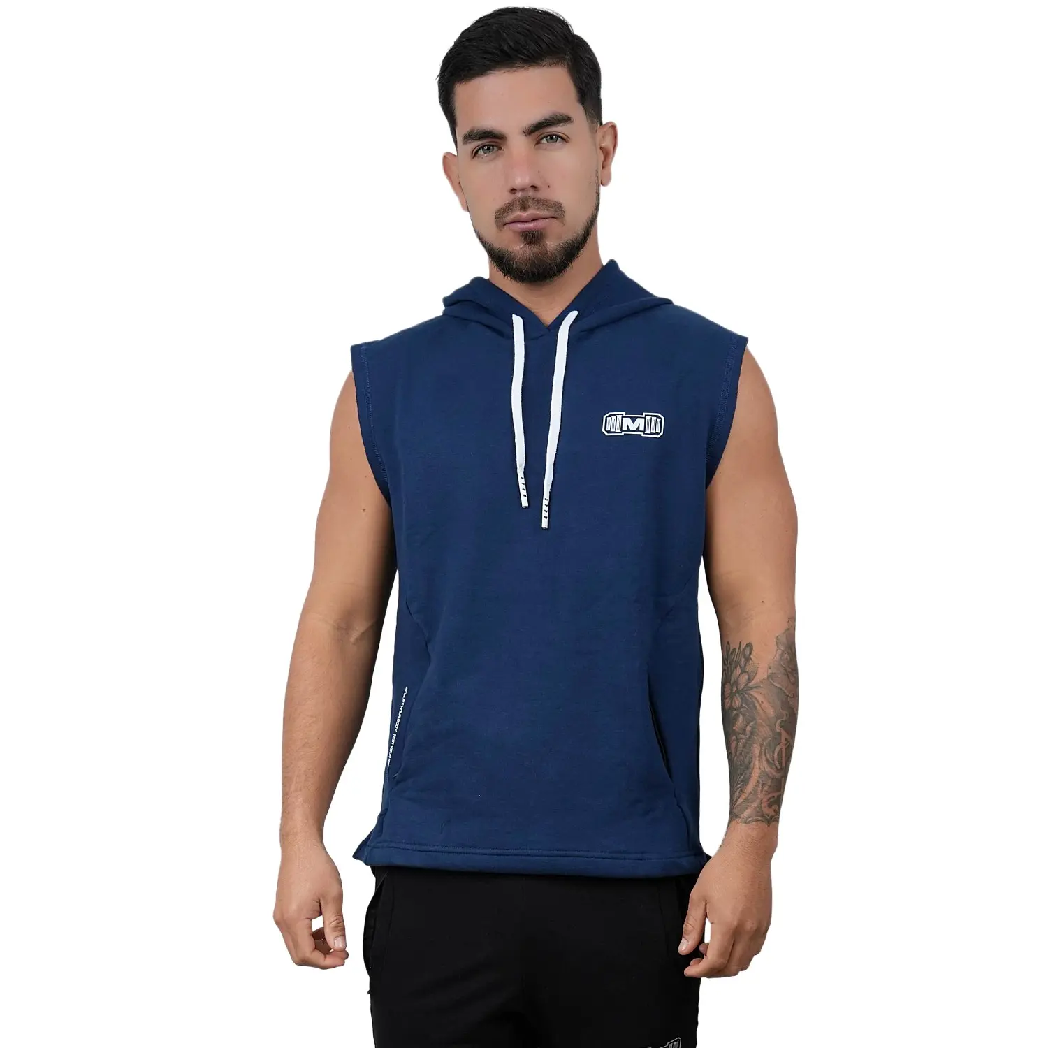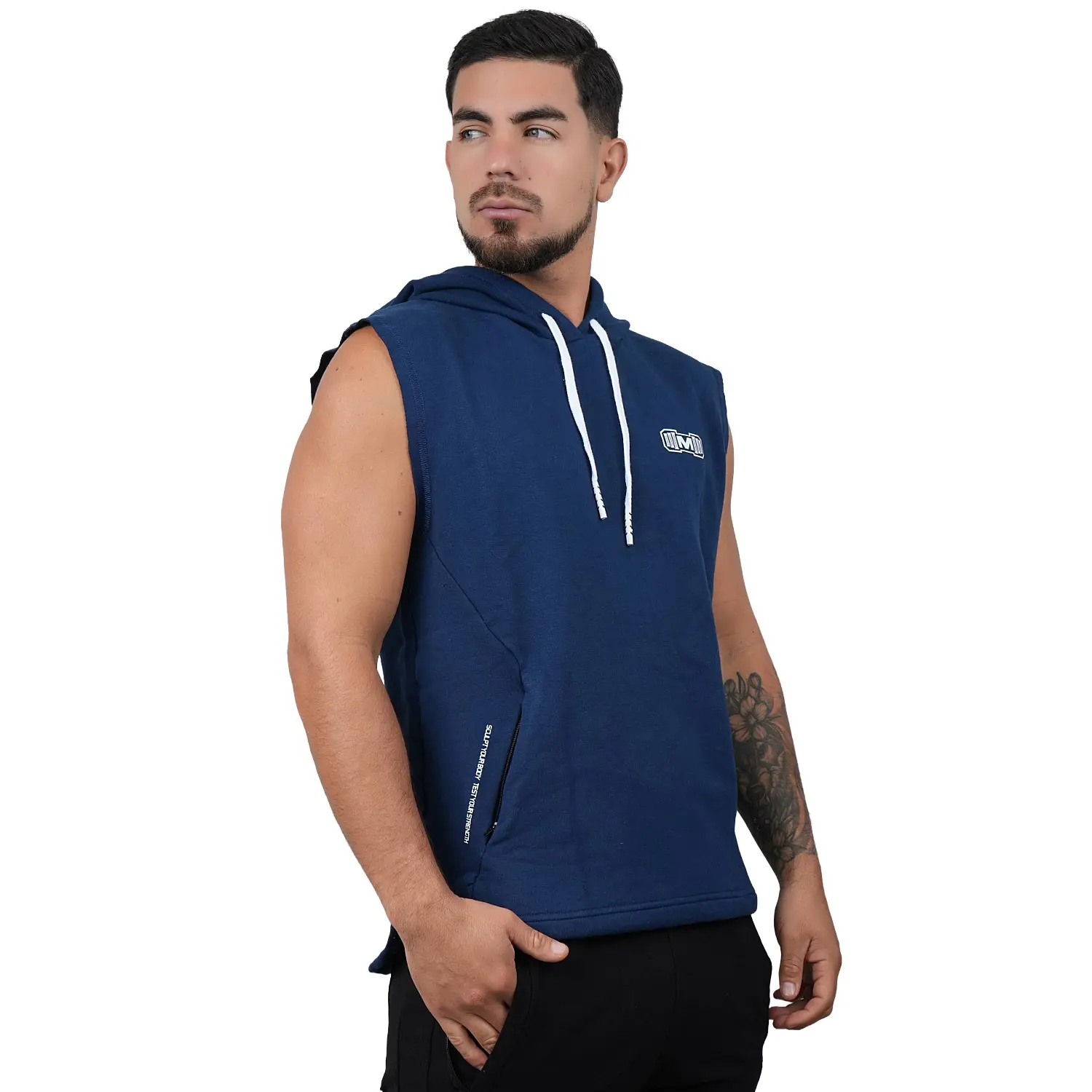 Polera Manga Cero para hombre, con capucha y pasador ajustable de color blanco. Tiene estampado color blanco y diseño deportivo, ideal para cualquier práctica deportiva.