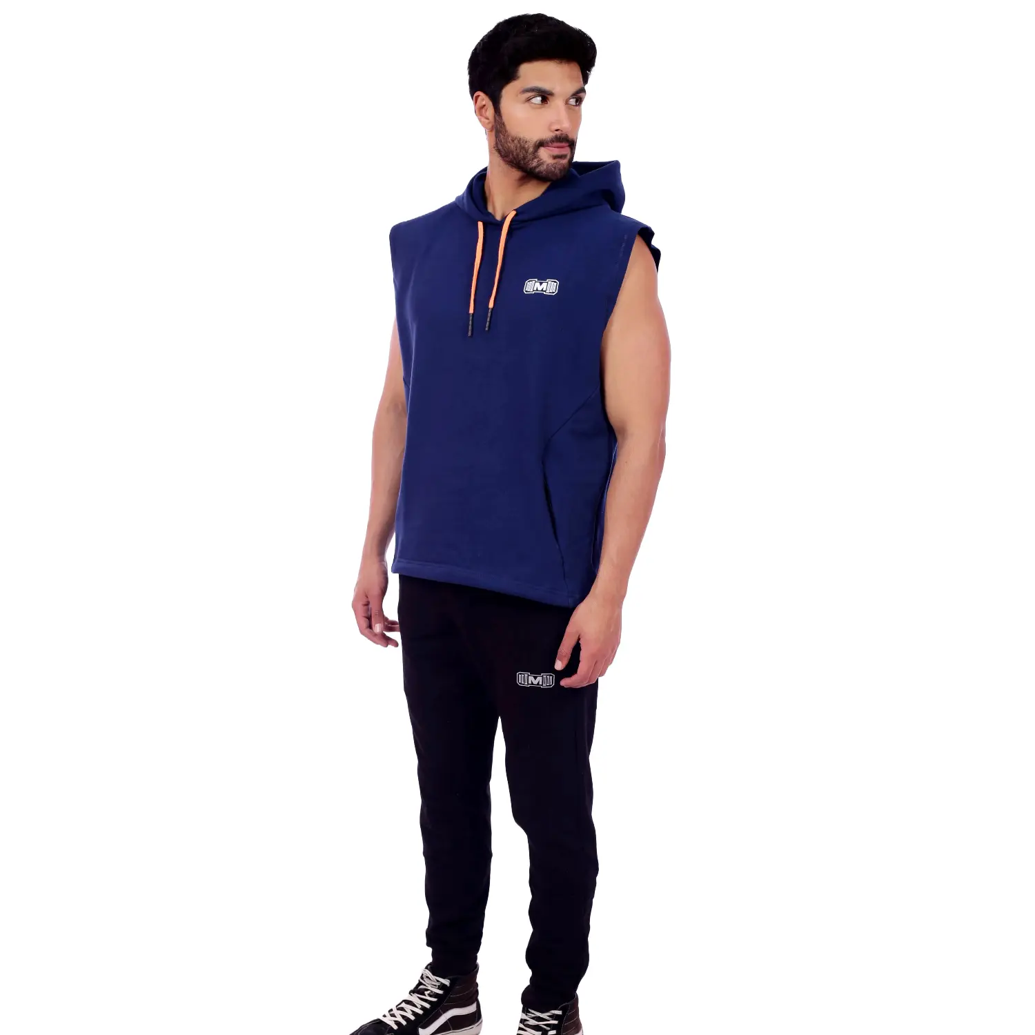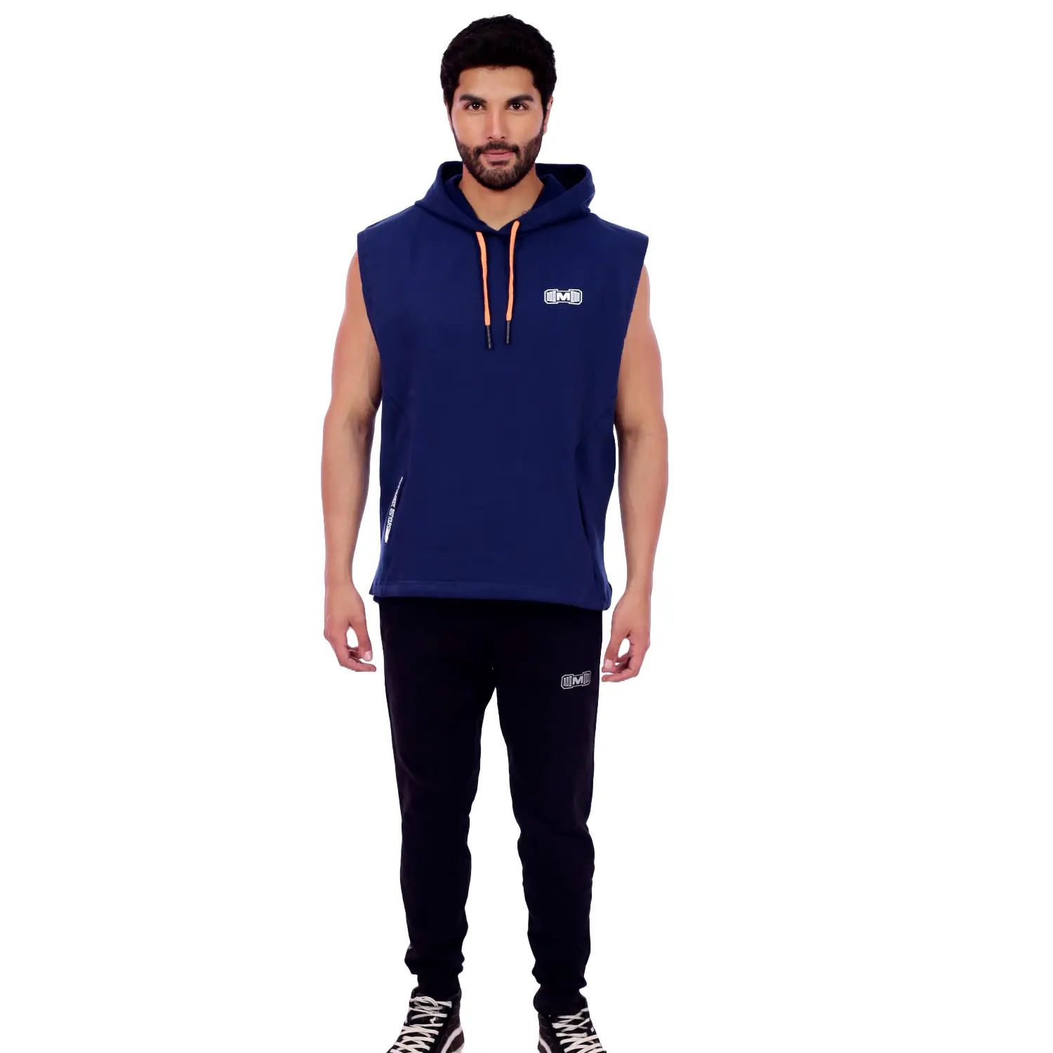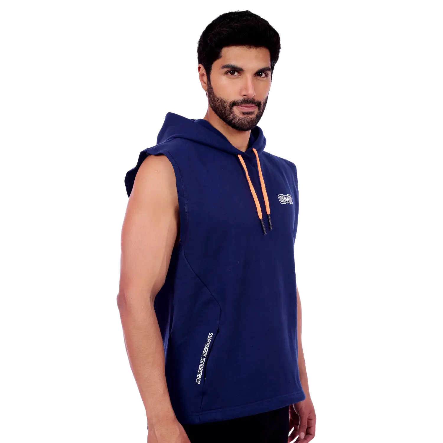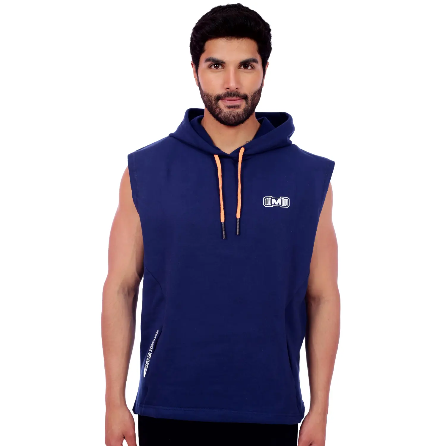Polera Manga Cero para hombre, con capucha y pasador ajustable de color naranja. Tiene estampado color blanco y diseño deportivo, ideal para cualquier práctica deportiva.