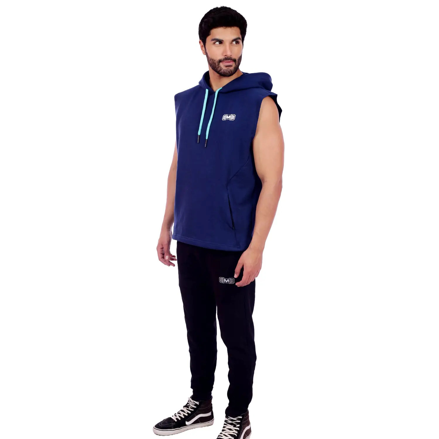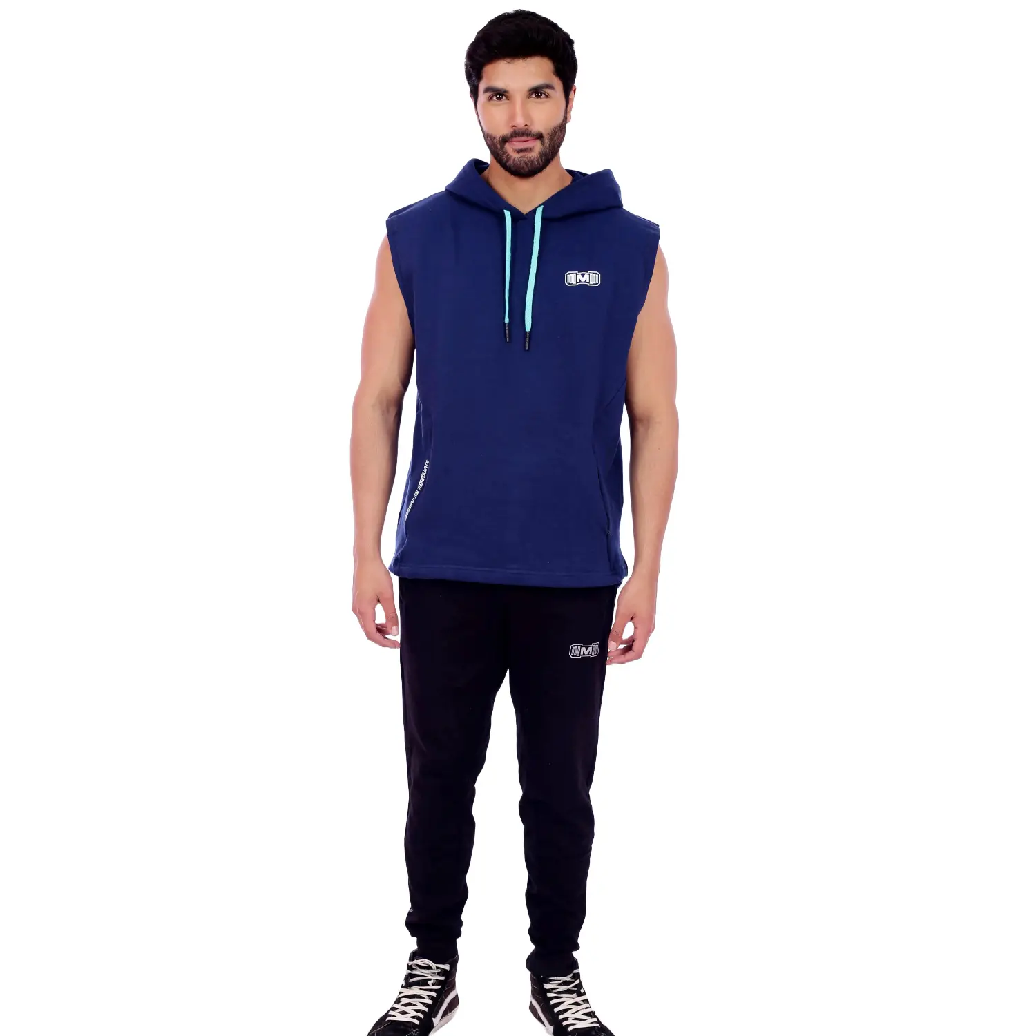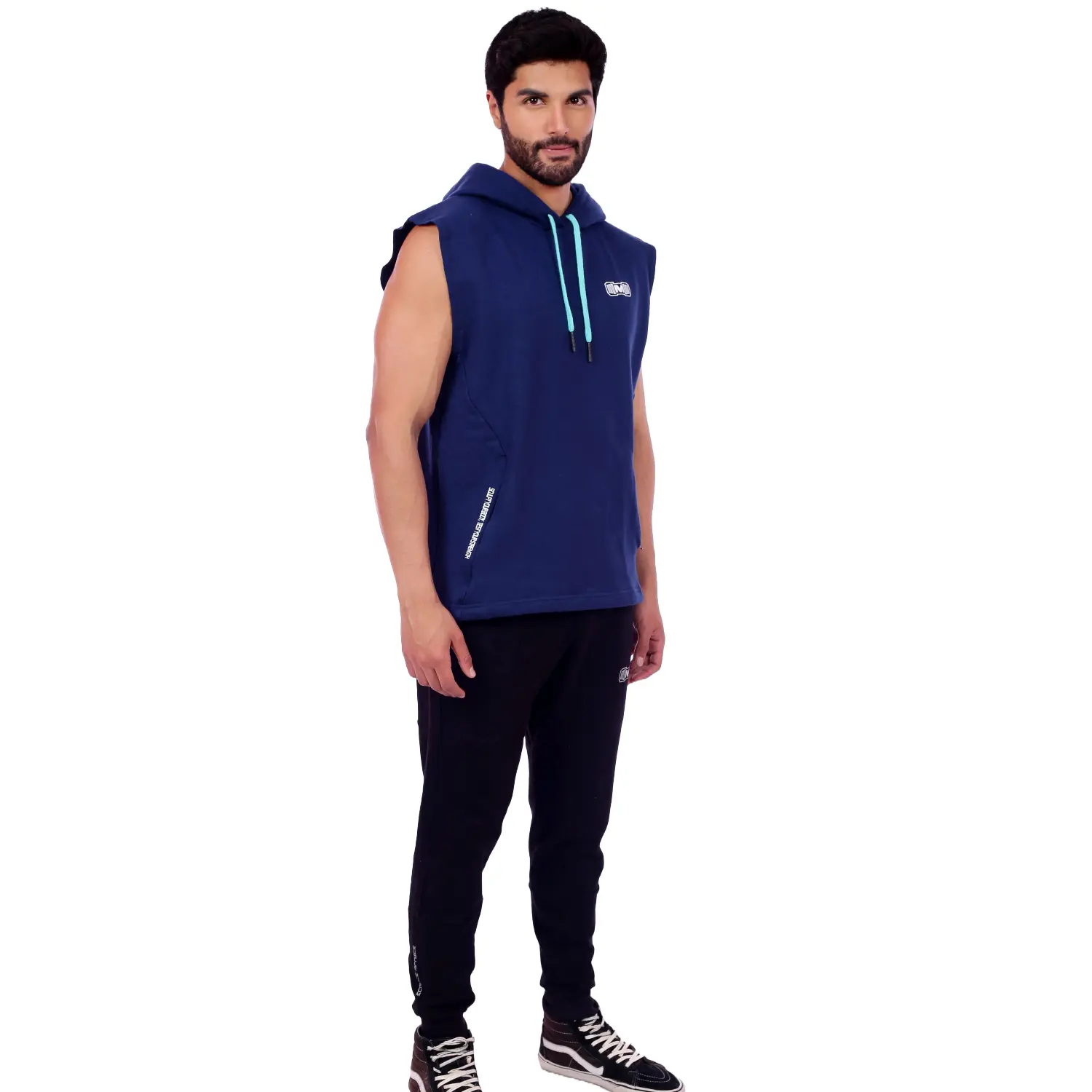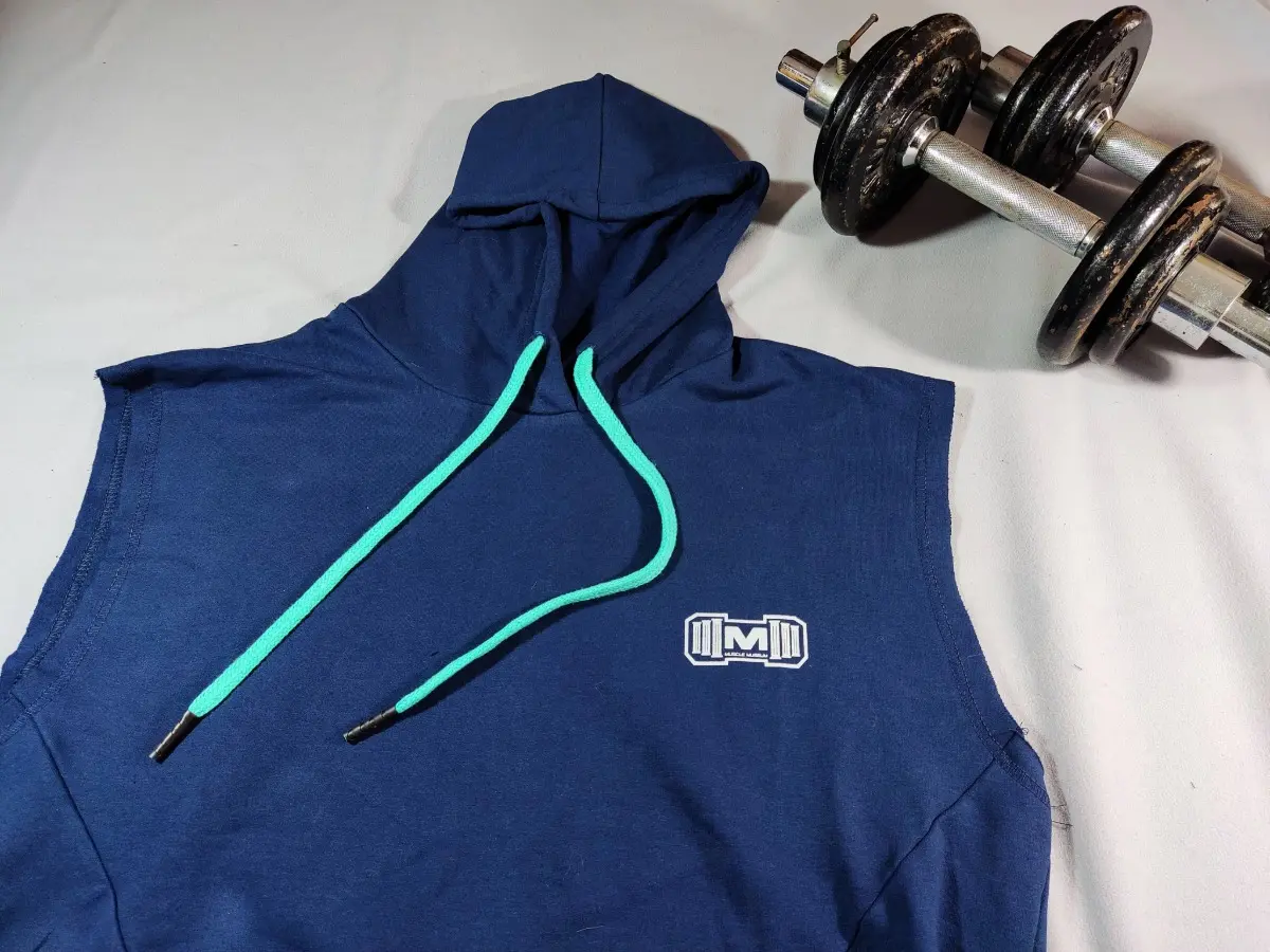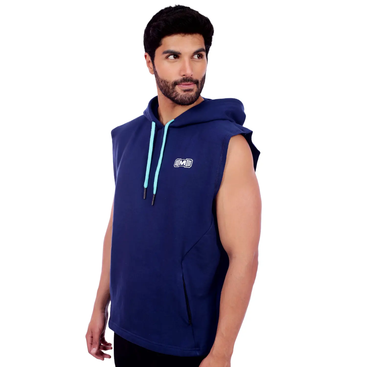Polera Manga Cero para hombre, con capucha y pasador ajustable de color turquesa. Tiene estampado color blanco y diseño deportivo, ideal para cualquier práctica deportiva.