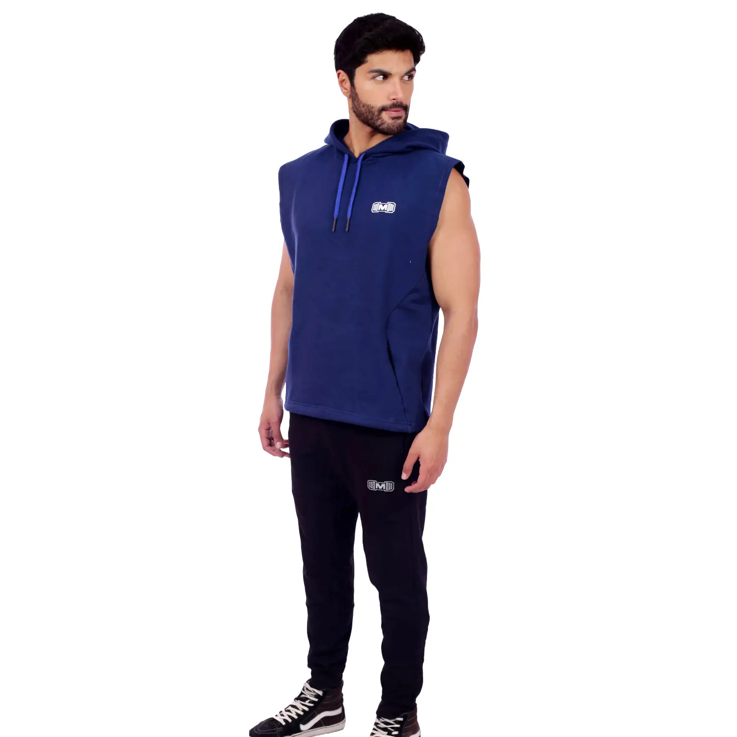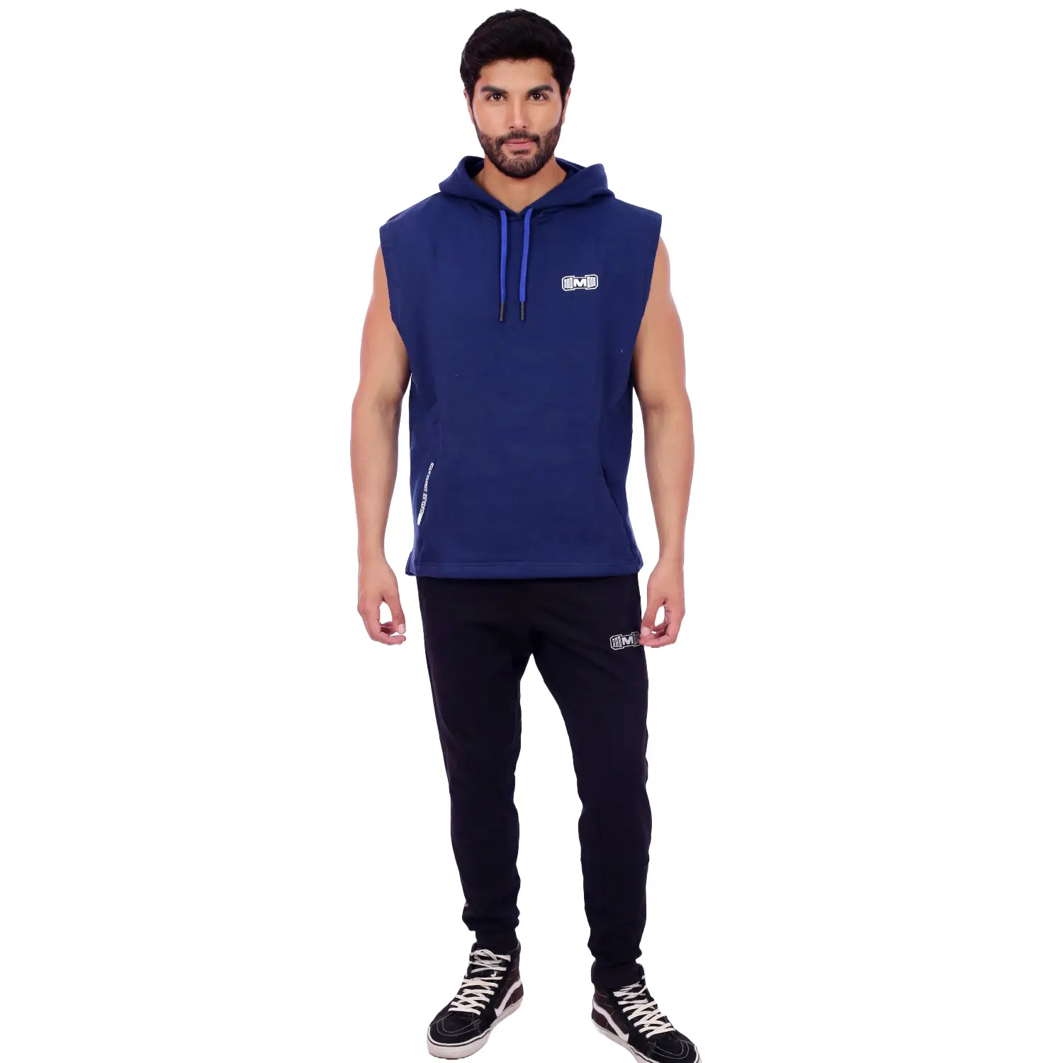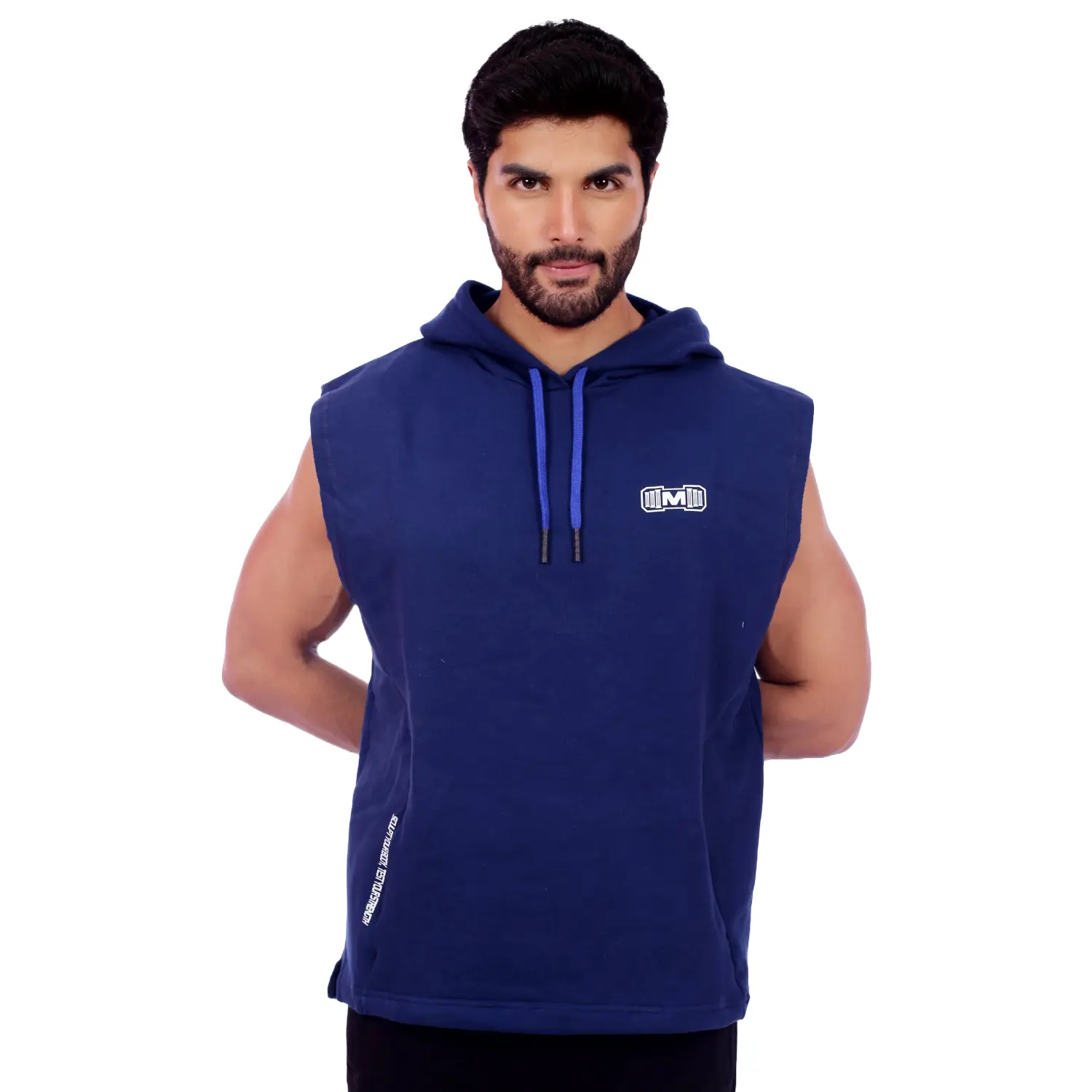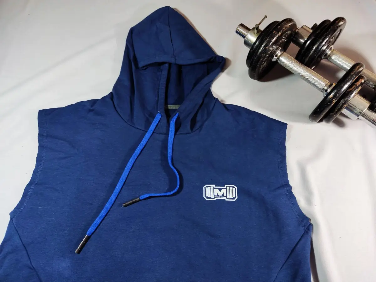 Polera Manga Cero para hombre, con capucha y pasador ajustable de color azul. Tiene estampado color blanco y diseño deportivo, ideal para cualquier práctica deportiva.