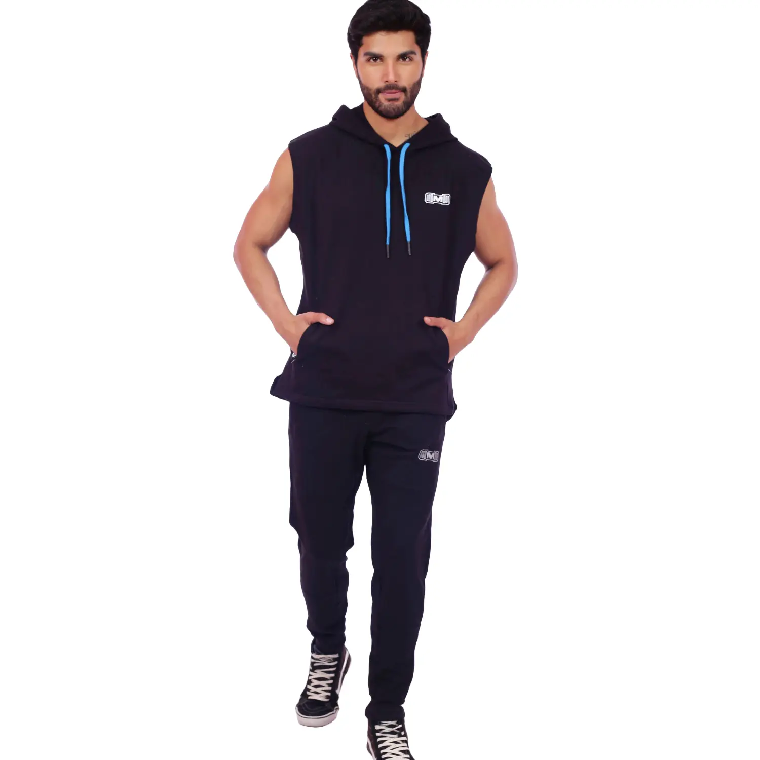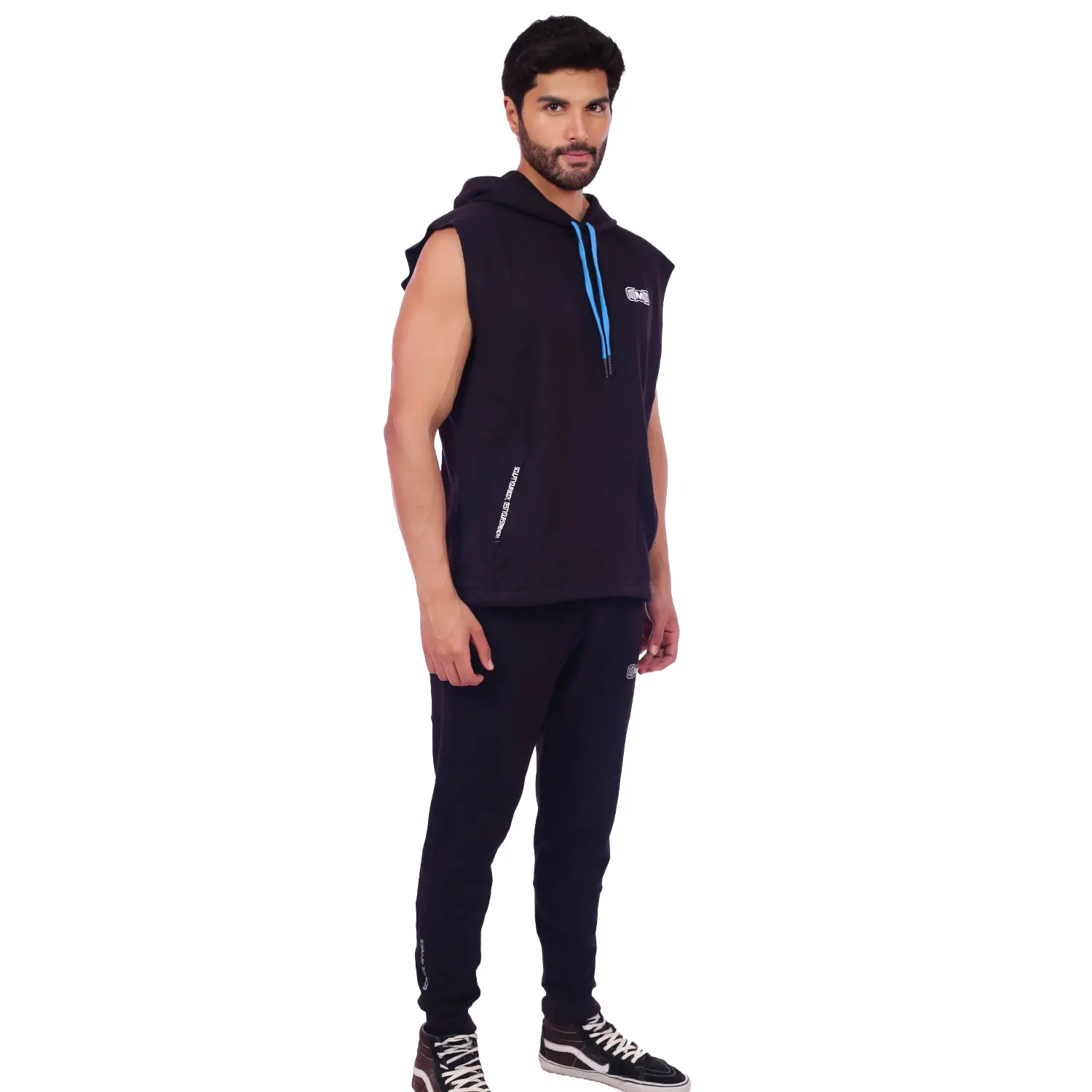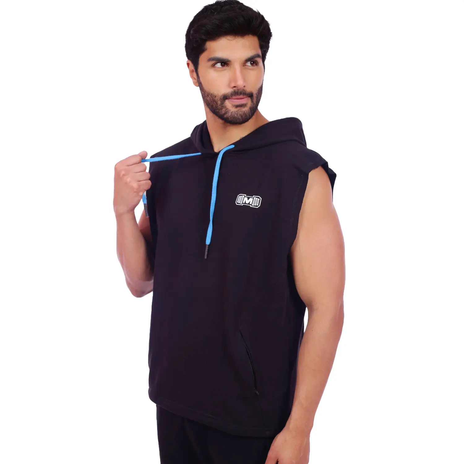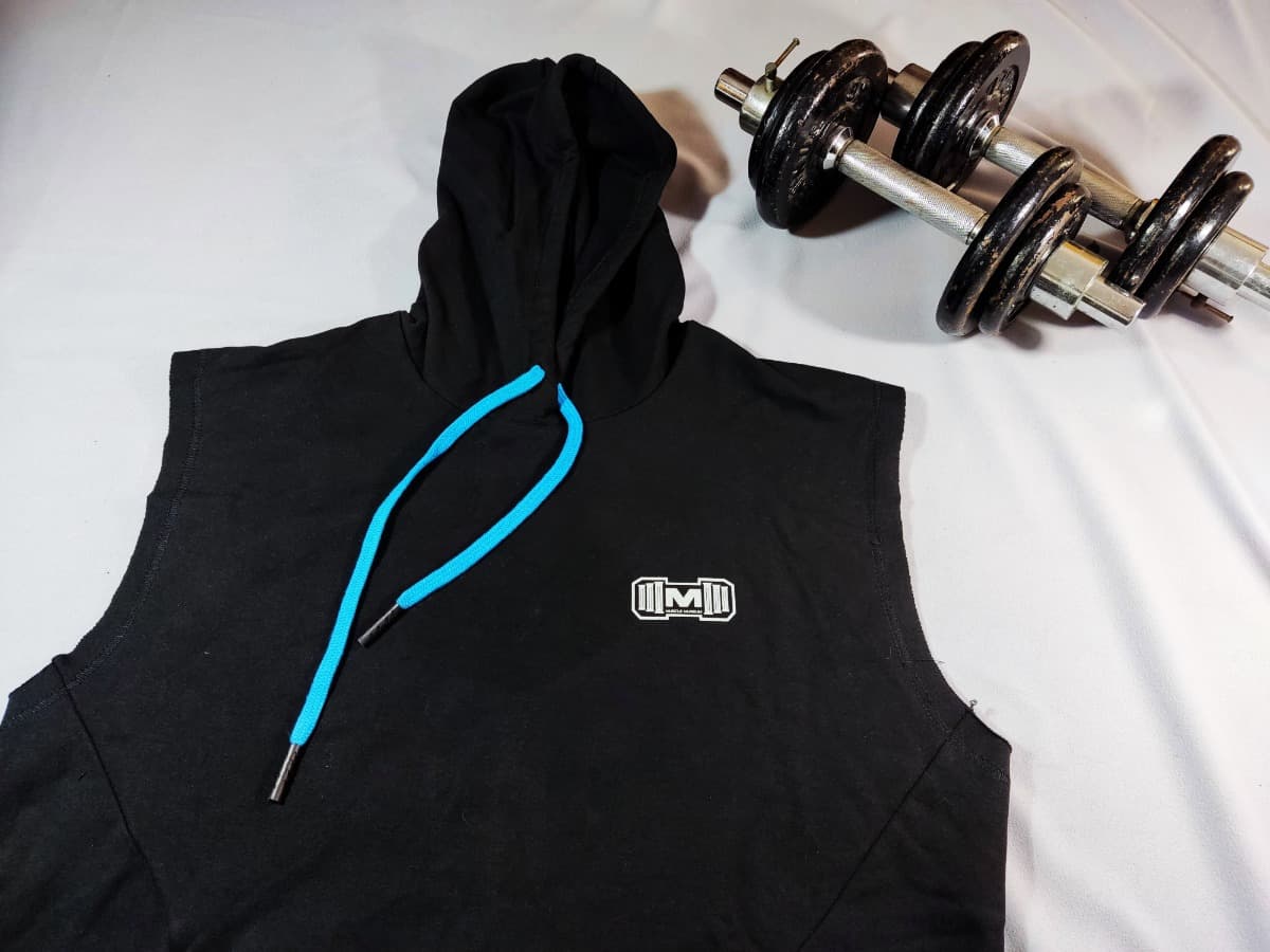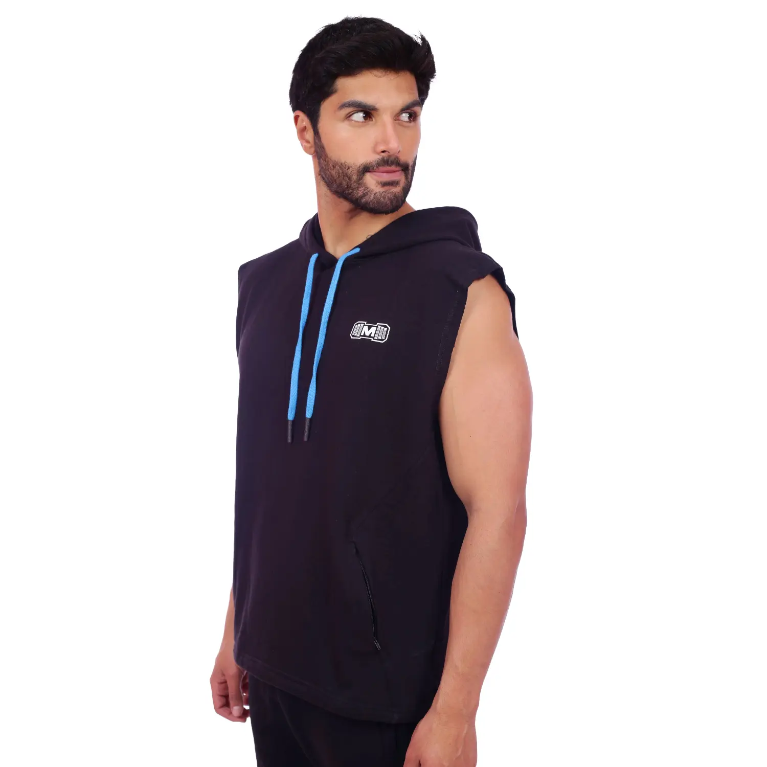 Polera Manga Cero para hombre, con capucha y pasador ajustable de color azul. Tiene estampado color blanco y diseño deportivo, ideal para cualquier práctica deportiva.