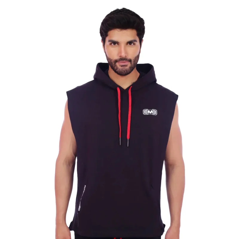 Polera Manga Cero para hombre, con capucha y pasador ajustable de color rojo. Tiene estampado color blanco y diseño deportivo, ideal para cualquier práctica deportiva.