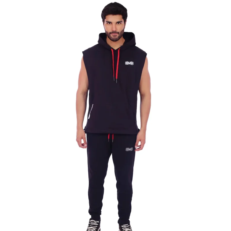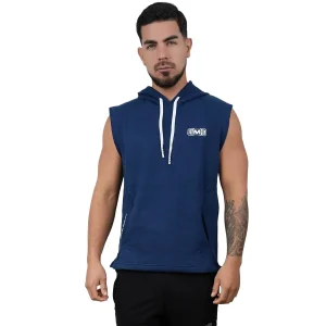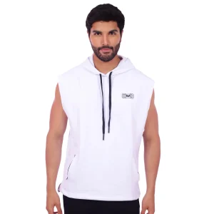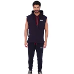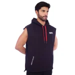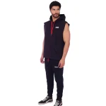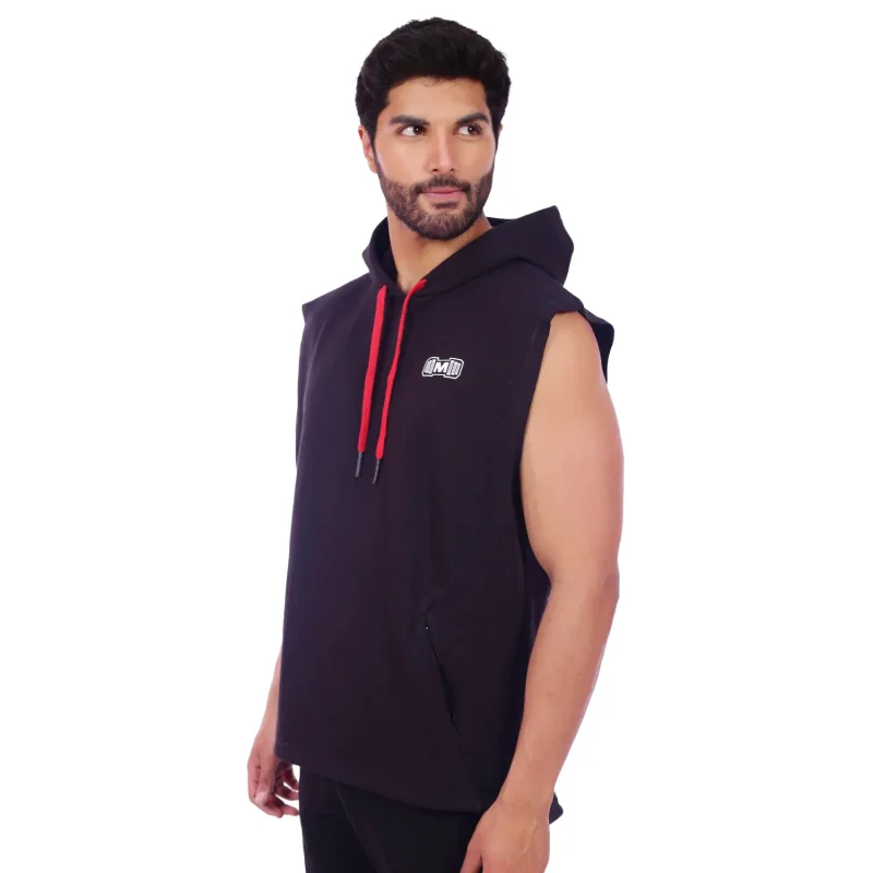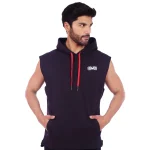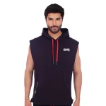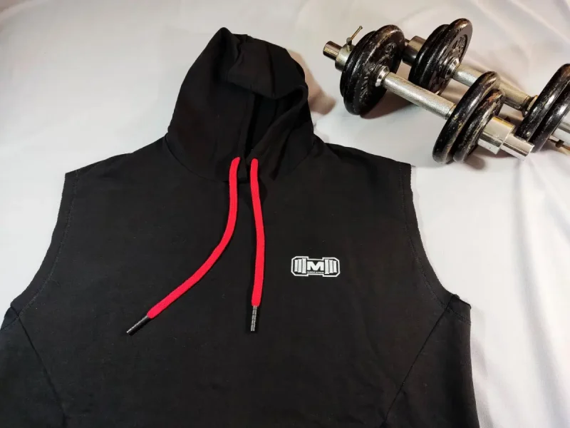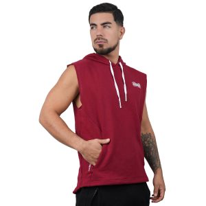 Polera Manga Cero para hombre, con capucha y pasador ajustable de color rojo. Tiene estampado color blanco y diseƱo deportivo, ideal para cualquier prƔctica deportiva.