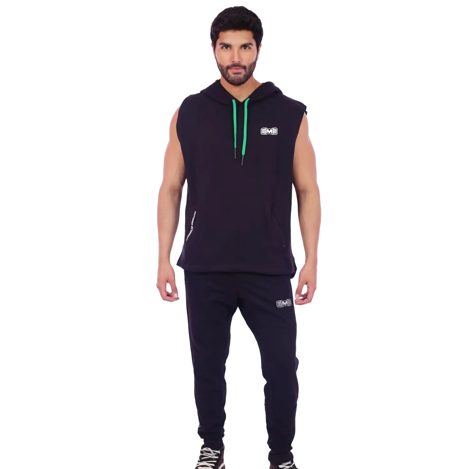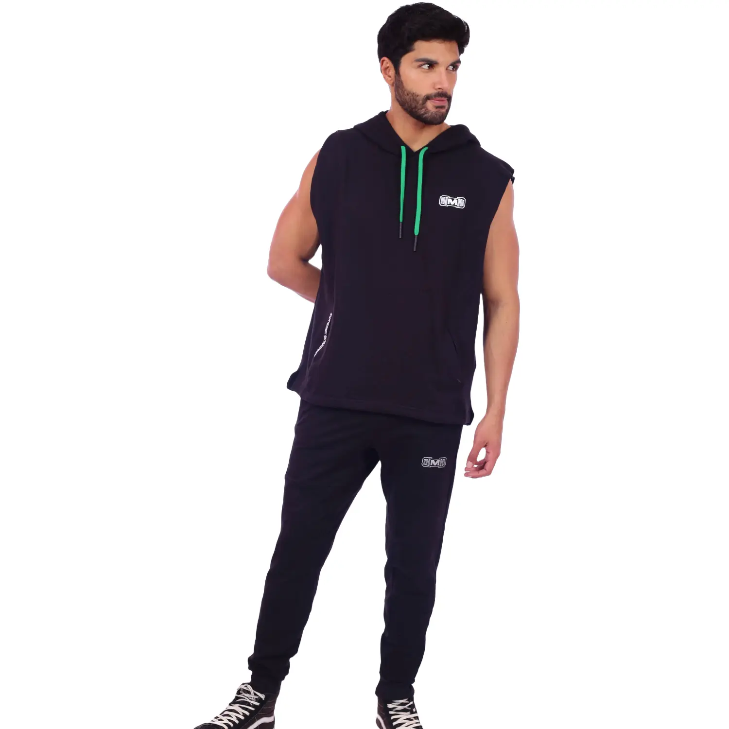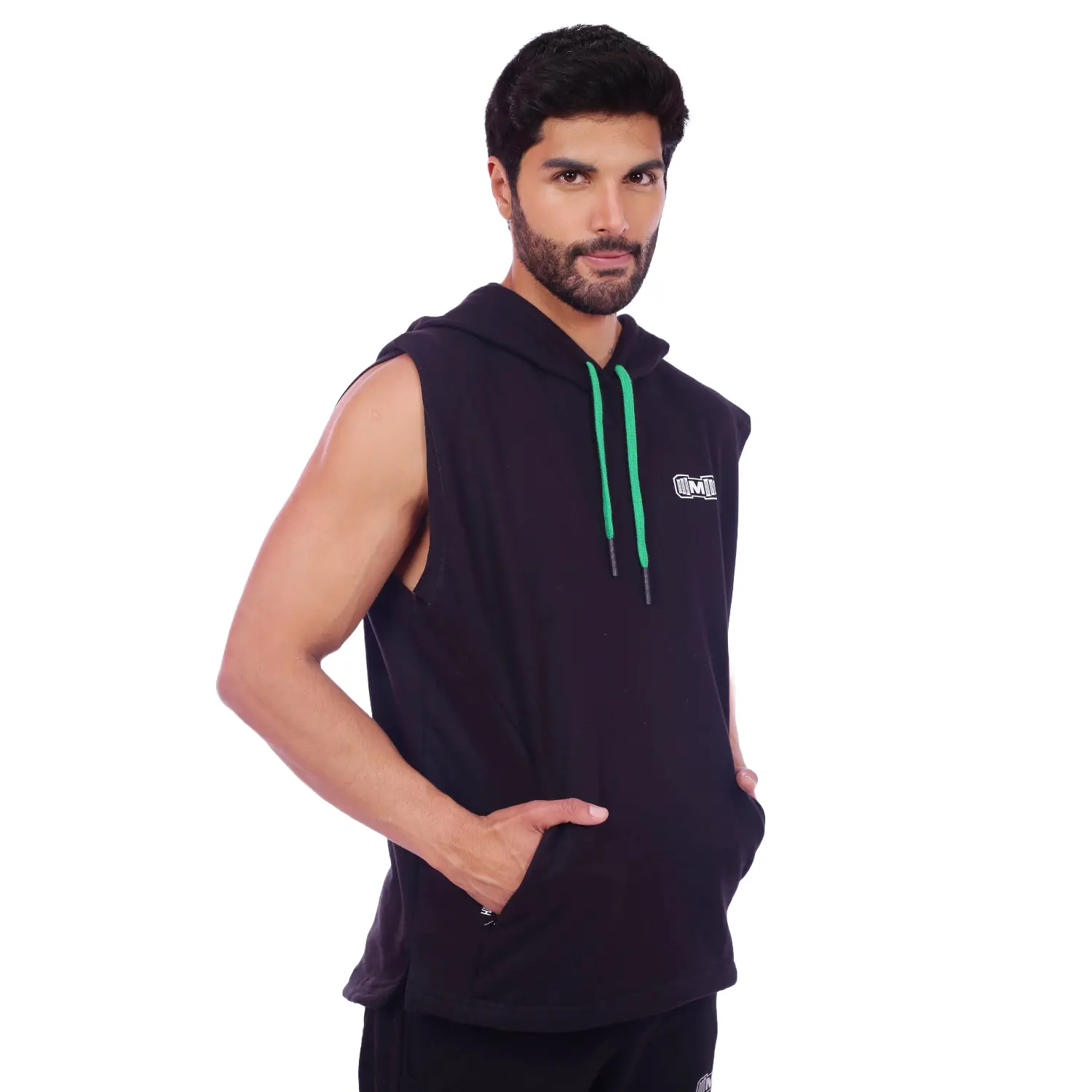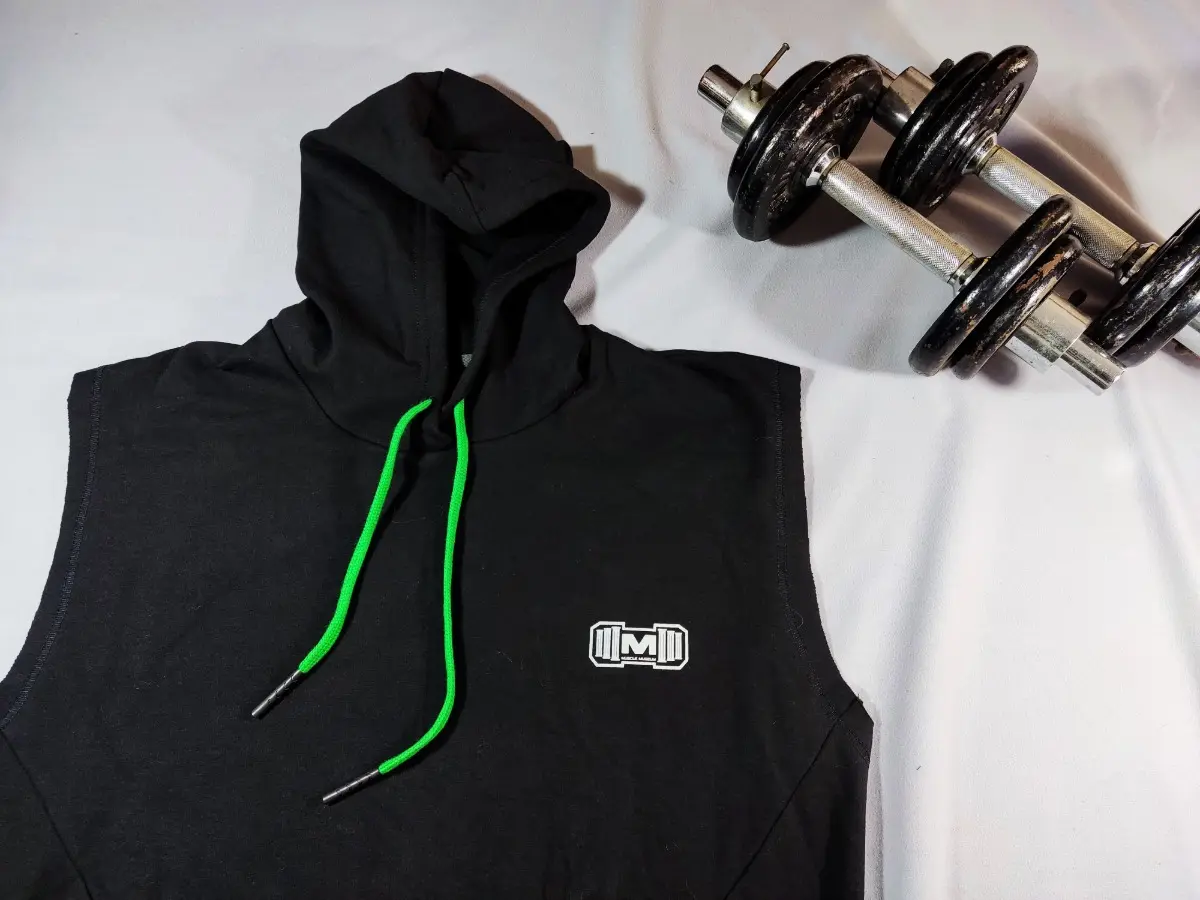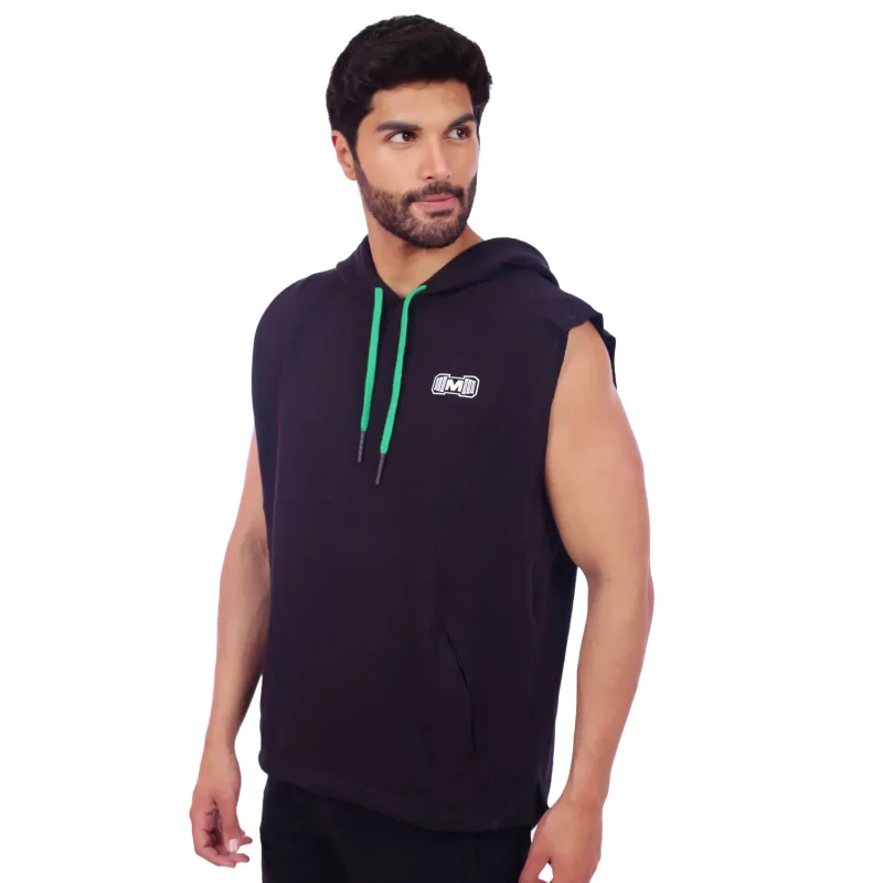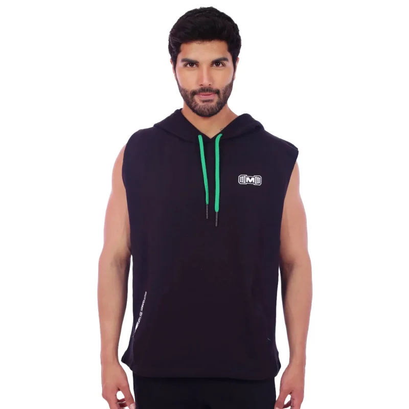 Polera Manga Cero para hombre, con capucha y pasador ajustable de color verde. Tiene estampado color blanco y diseño deportivo, ideal para cualquier práctica deportiva.