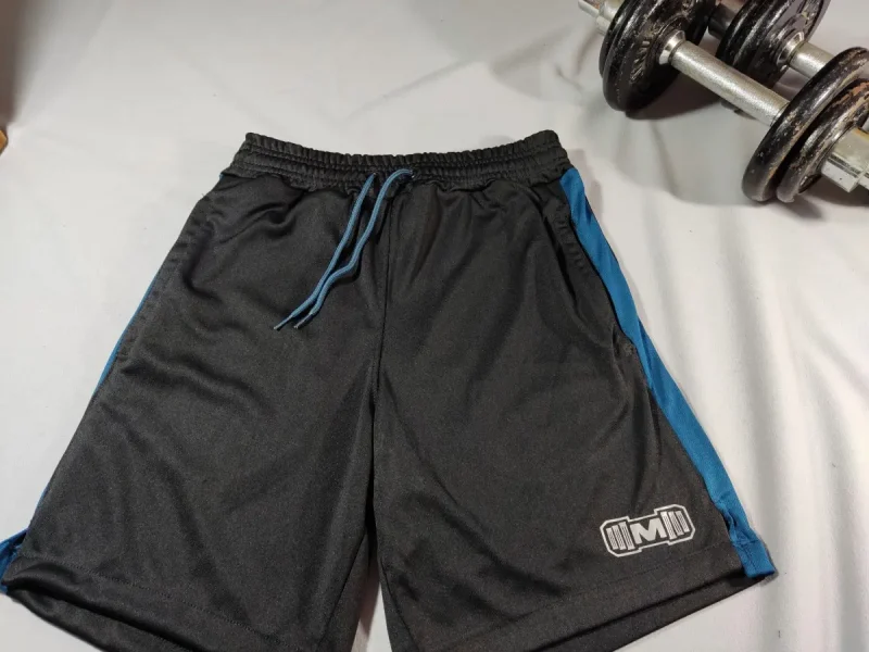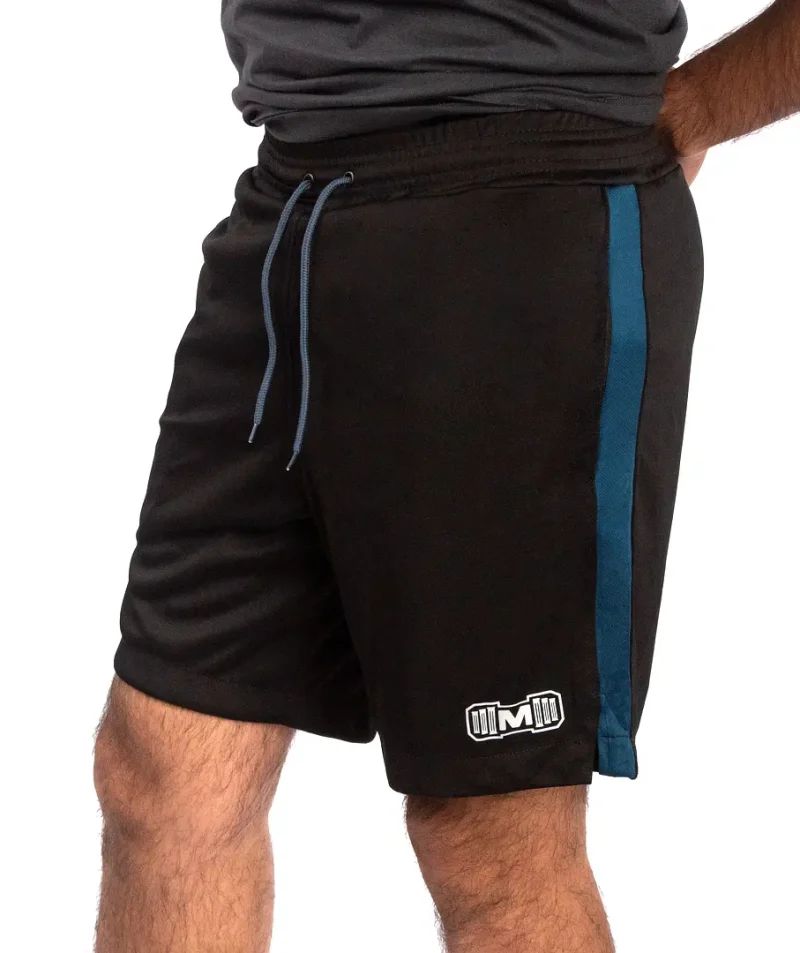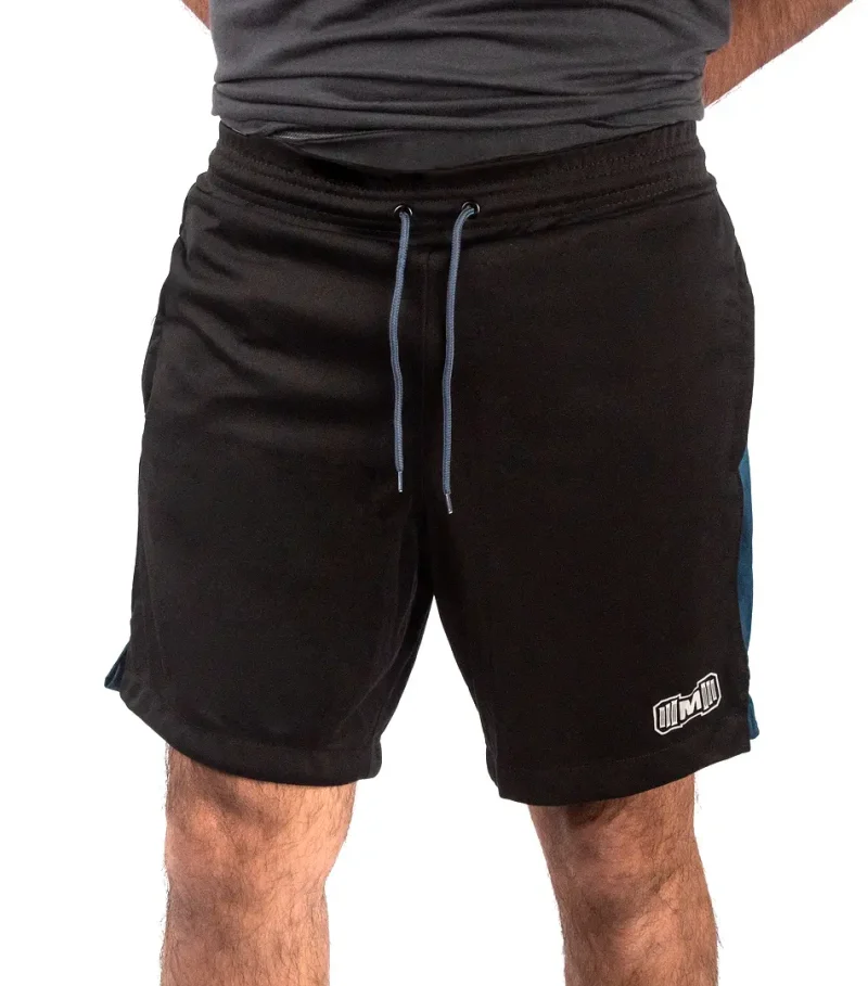 Short Deportivo color Negro con franja color azul acero. Ideal para entrenar en el gimnasio y practicar deporte. Hecho de Material Interfil deportivo. Resistente y duradero. Cuenta con bolsillos laterales con cierre. Con estampado color reflectivo y diseño deportivo para mayor comodidad.