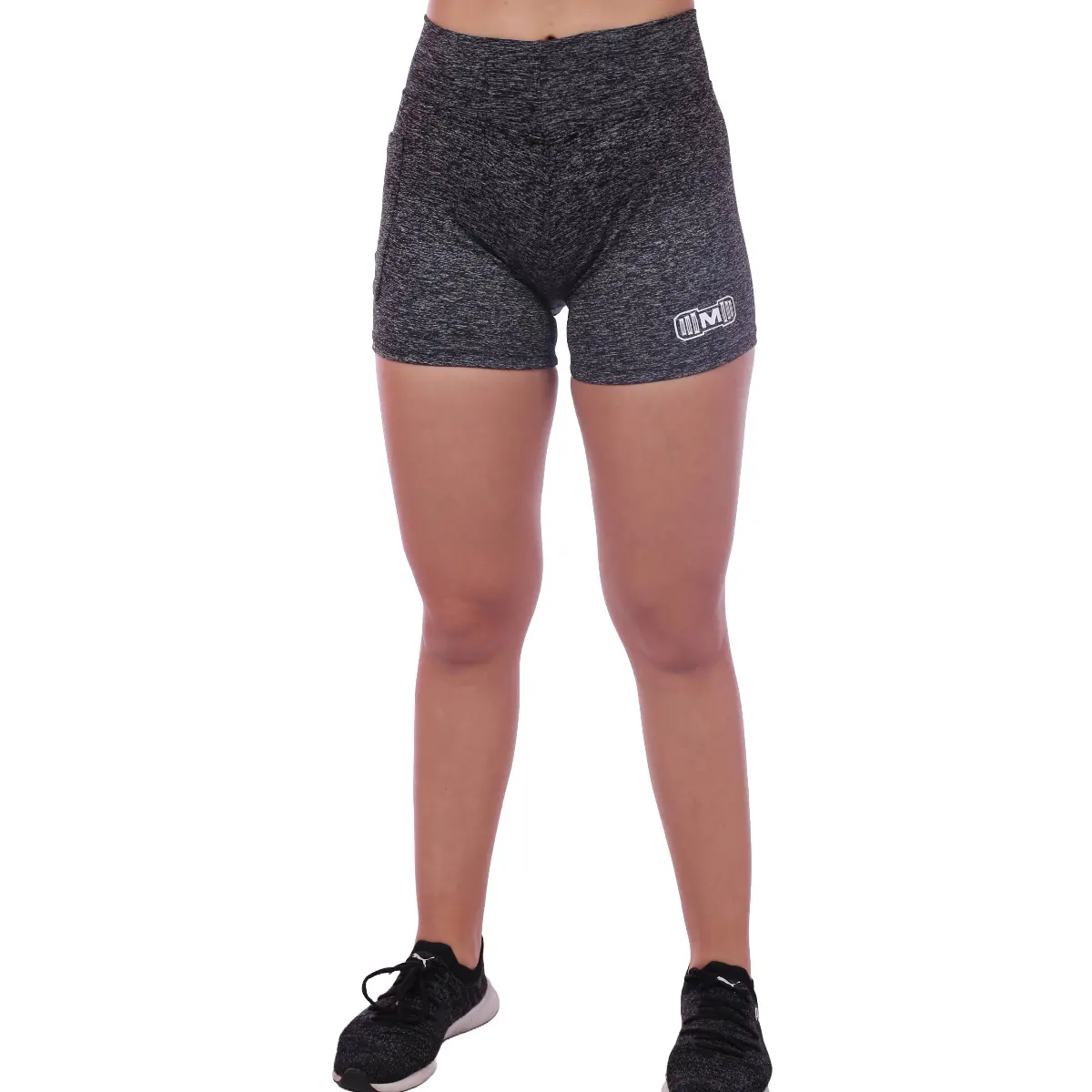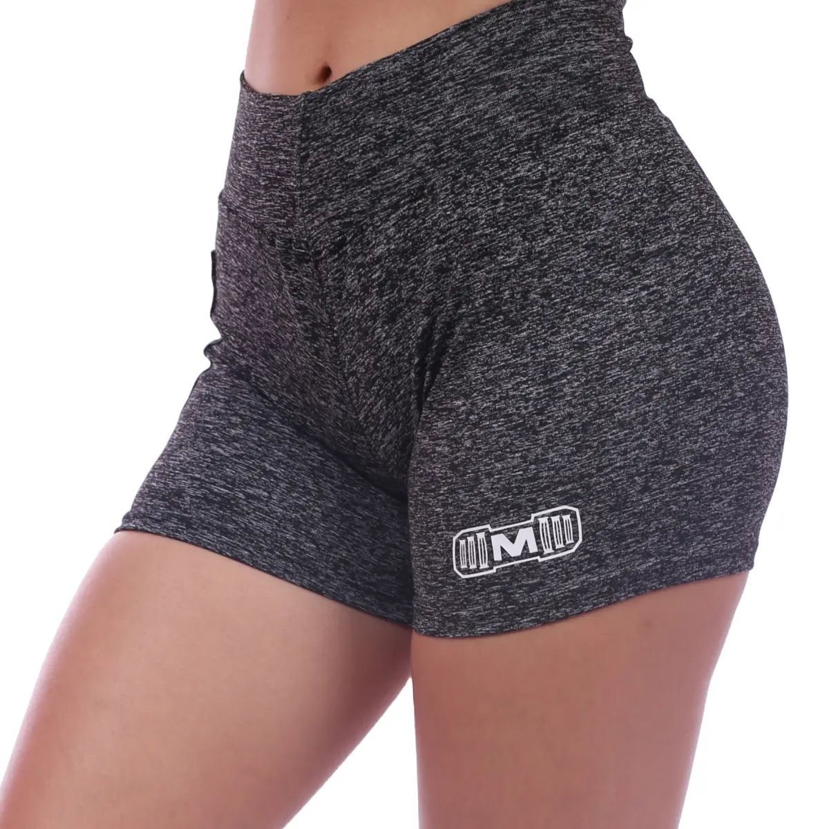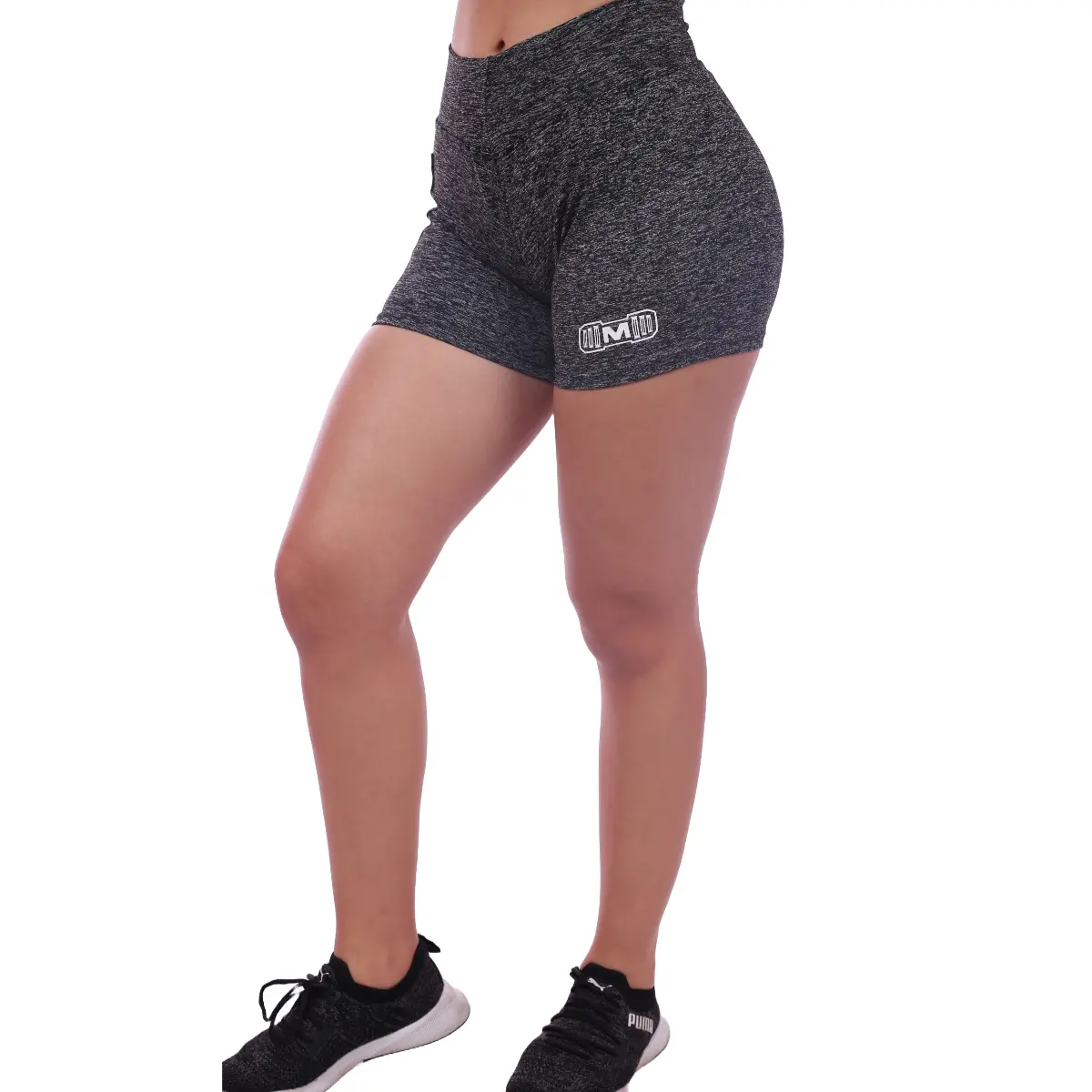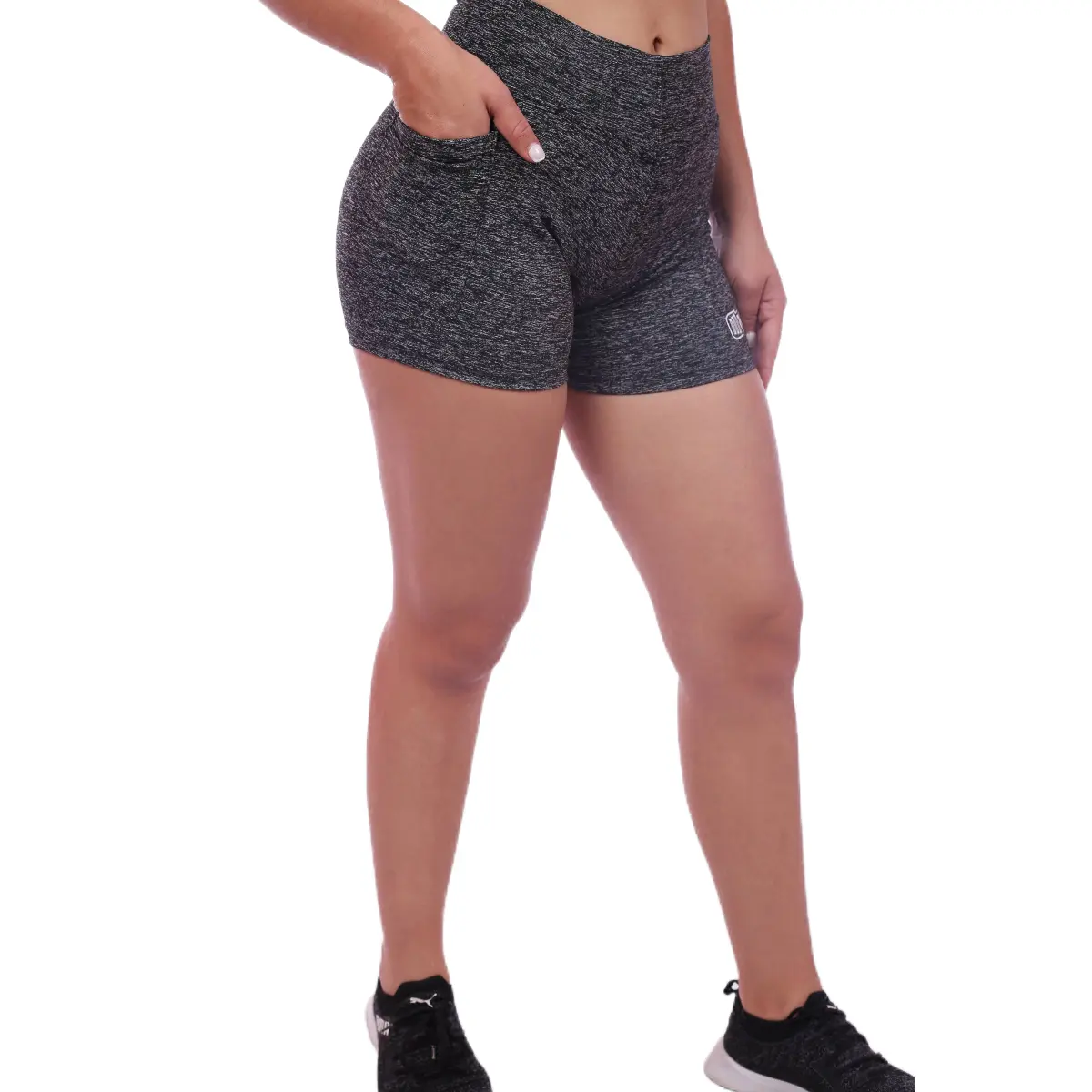 Short Pantaloneta Deportiva color Negro Jaspeado para Mujer. Ideal para entrenar en el gimnasio y practicar deporte. Hecho de Material Suplex deportivo. Resistente y duradero, que se estira y acomoda a tu cuerpo. Cuenta con bolsillo lateral derecho ideal para guardar lo que necesites durante tus actividades. con estampado color Blanco y diseño deportivo para mayor comodidad.
