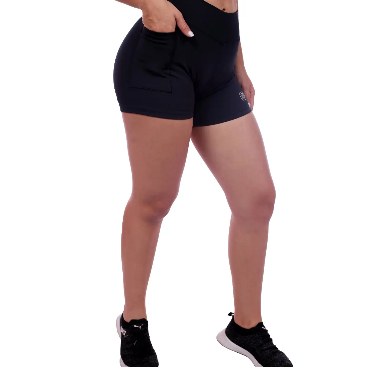 Short Pantaloneta Deportiva color Negro para Mujer. Ideal para entrenar en el gimnasio y practicar deporte. Hecho de Material Suplex deportivo. Resistente y duradero, que se estira y acomoda a tu cuerpo. Cuenta con bolsillo lateral derecho ideal para guardar lo que necesites durante tus actividades. con estampado color Blanco y diseño deportivo para mayor comodidad.