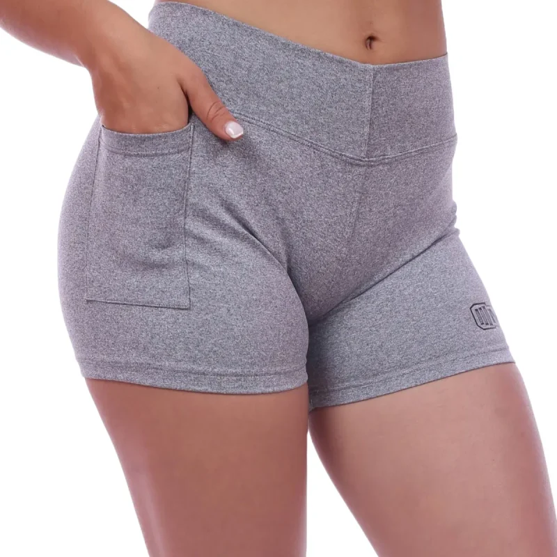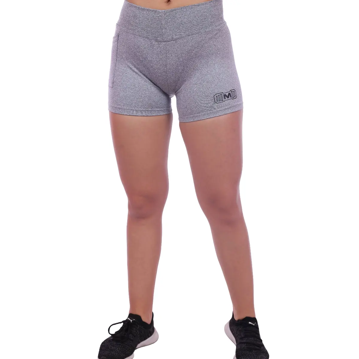 Short Pantaloneta Deportiva color Plomo Jaspeado para Mujer. Ideal para entrenar en el gimnasio y practicar deporte. Hecho de Material Suplex deportivo. Resistente y duradero, que se estira y acomoda a tu cuerpo. Cuenta con bolsillo lateral derecho ideal para guardar lo que necesites durante tus actividades. con estampado color Negro y diseño deportivo para mayor comodidad.